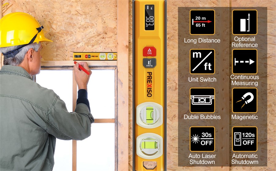 פלס מקצועי עם מד מרחק לייזר מובנה - עד 20 מ'