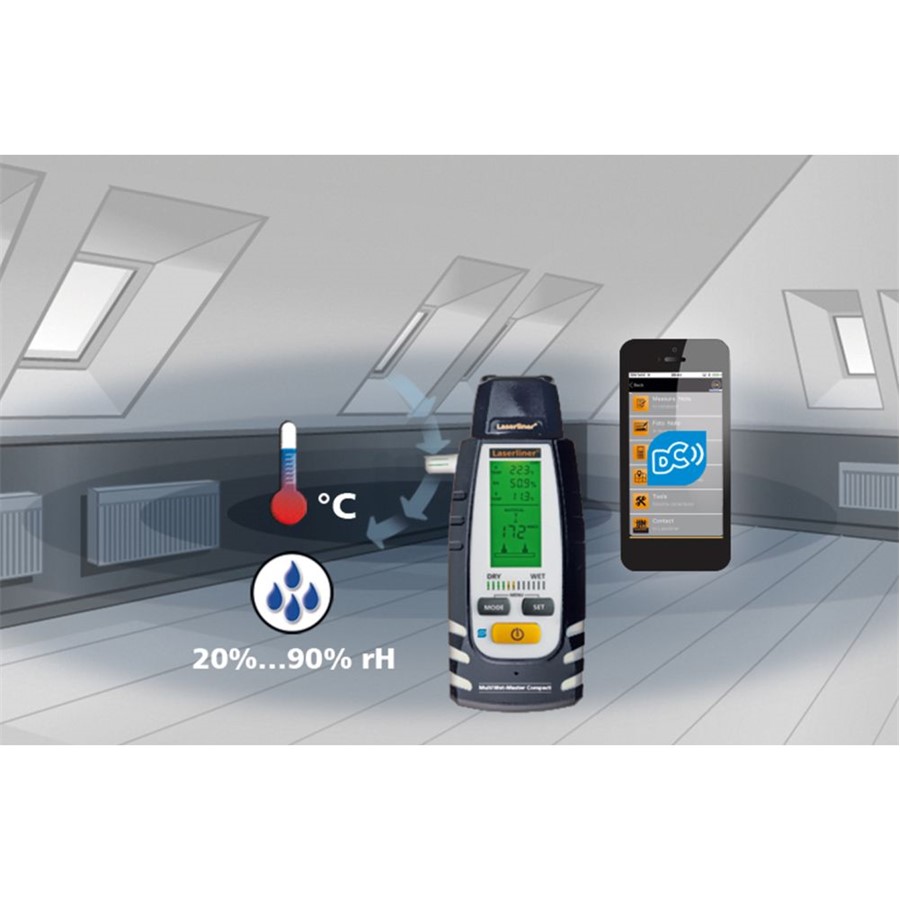 מכשיר המשלב אפשרות מדידה בסריקה או בנעיצה קישורית BLUETOOTH לאפליקציית LASERLINER (חינמית) להעברה ושמירת הנתונים נתונים של 108 סוגי עץ ו 31 סוגים של חומרי בניין מוזנים מראש למכשיר מסך LCD מואר חיישן מדידת לחות סביבתית נשלף טווח מדידת לחות 20%-90% לחות טווח מדידת טמפרטורה של מינוס 10 עד פלוס 60 מעלות צלזיוס